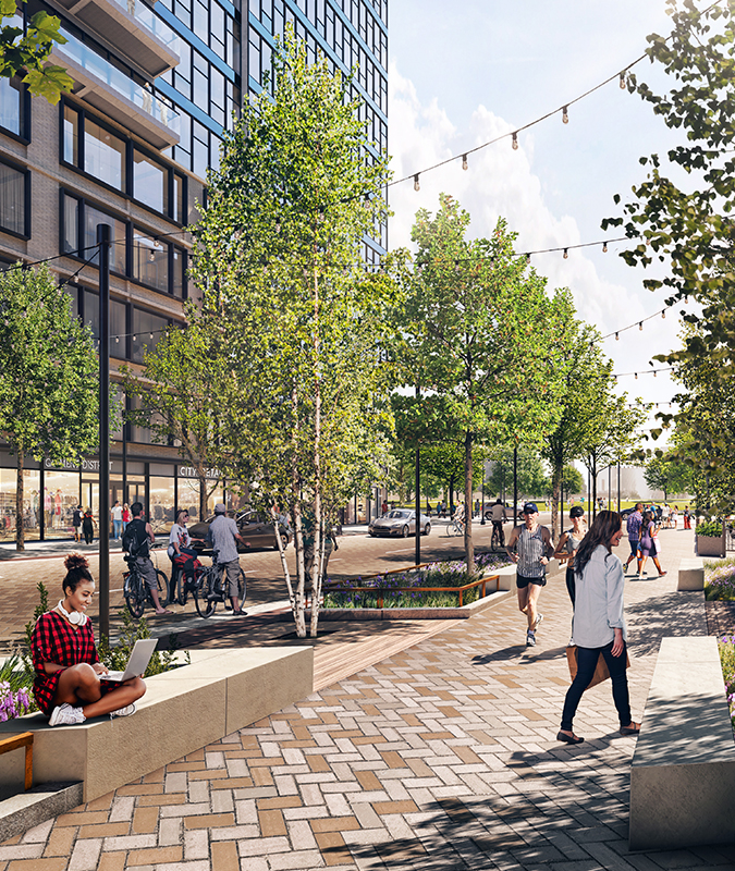 The Market District will feature an innovative, mile-long bioswale system that absorbs stormwater, reduces pollutants and moves water detention off building site. These “rain gardens” will also help: